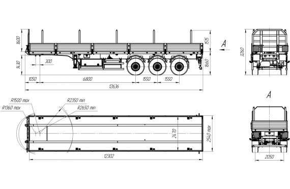 28500 кг, шины 425/85 R21/6+1, длина 12223 мм, ССУ 1500 мм, рессорная подвеска, 3 оси