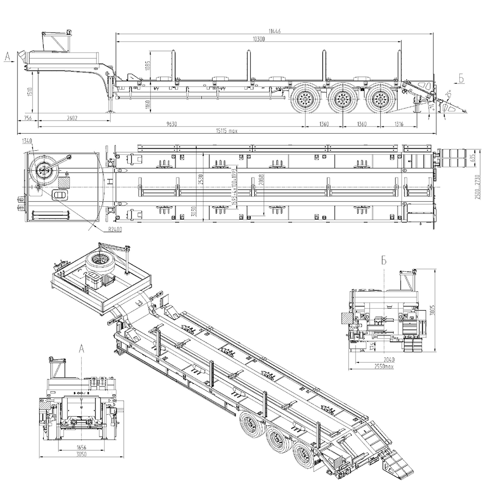 39000 кг, шины 385/65R22,5 или 445/65R22,5 / 6+1, платформа 11461 по трапам x 2500 с уширителями до 3000 мм, треугольные аппарели, ССУ 1430 мм, рессорная подвеска, съемные стойки или раздвижные коники 1500 мм, с бортами или без