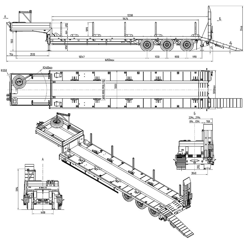 39000 кг, шины 385/65R22,5 или 445/65R22,5 / 6+1, платформа 11080 до трапов) x 2500 с уширителями до 3000 мм, ССУ 1510 мм, рессорная подвеска, съемные стойки 1500 мм, механические трапы