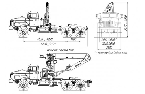 6х6, 275 л.с., коробка передач ЯМЗ-1105, КМУ: зацеп на капот, грузовой момент 27 тм, вылет 8 м, г/п 9 т.
